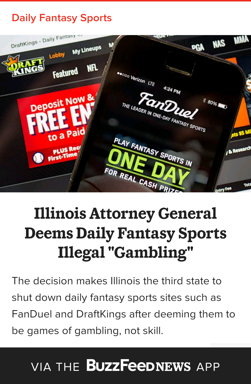 Illinois Attorney General Deems Daily Fantasy Sports Illegal “Gambling” http://www.buzzfeed.com/salvadorhernandez/illinois-attorney-general-deems-daily-fantasy-sports-illegal